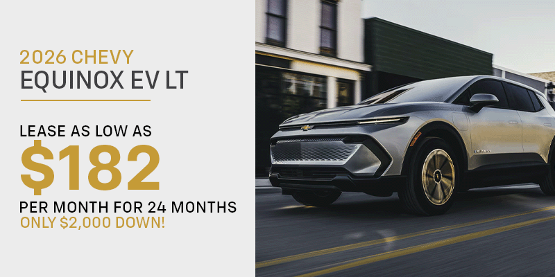 $299/month lease on a new 2026 Chevrolet Equinox EV LT. Lease price based on stock #N26103 with MSRP of $37,390. $2,000 trade equity or cash down, plus all taxes, fees, first payment, and bank acquisition fee due at signing. All rebates applied. Must have a ‘19 or newer leased vehicle in household and must currently have a non-GM '12 vehicle in household to qualify. 24 month lease at 10k miles per year. Mileage charge of $.25/mile over 20,000 miles. Lessee is responsible for maintenance and excess wear. For qualified buyers with GM Financial approval. Offer only valid on vehicles in stock. Residency and other restrictions may apply, see dealer for details.