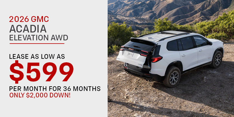 *$599/month lease on a new 2026 GMC Acadia Elevation. Lease price based on stock #N26130 with MSRP of $47,035. $2,000 trade equity or cash down, plus all taxes, fees, first payment, and bank acquisition fee due at signing. All rebates applied. Must have current ‘19 or newer Buick or GMC lease in household to qualify. 36 month lease at 10k miles per year. Mileage charge of $.25/mile over 30,000 miles. Lessee is responsible for maintenance and excess wear. For qualified buyers with GM Financial approval. Offer only valid on vehicles in stock. Residency and other restrictions may apply, see dealer for details.